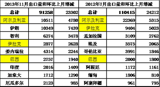 今年11月环比增长2.3万台;而12年的7月出口量突破11万台,环比增长2.4万,可以与之相提并论。而今年的走强是年末走势,这也是国内自主品牌走势偏弱的时期。今年11月12年7月的环比增长的主要动力都是几大主力市场的波动,尤其是阿尔及利亚和伊拉克、巴西等都是波动较大的。但今年 的伊朗波动更为巨大,11月1万台出口,环比增长7439台。