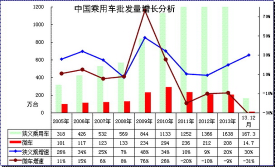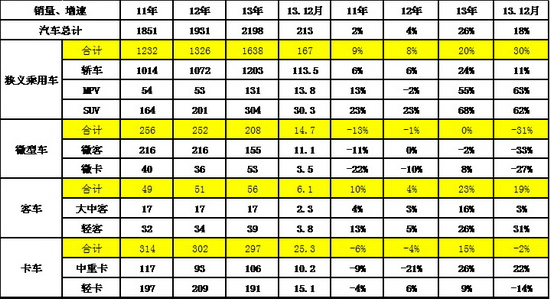 根据全国乘联会数据,13年狭义乘用车同比增长20%,而12月的增速是30%,12月异常火爆。总体看狭义乘用车的增速在15%左右是较正常的,13年的12月增速是异常不可持续的。