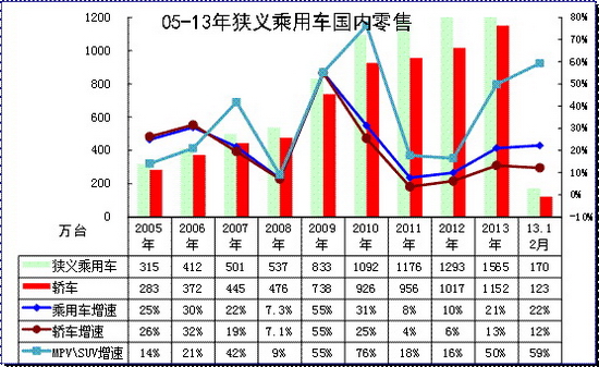 根据全国乘联会数据,2013年1-12月的中国狭义乘用车综合零售销量1395万台,增速为21%;由于11年和12年增速都在8-10%之间,处于近8年来的增速谷底,13年车市零售走强有前两年的底部支撑。