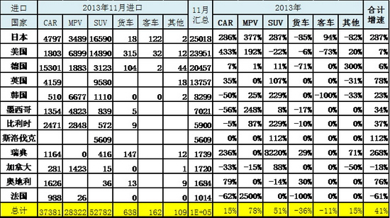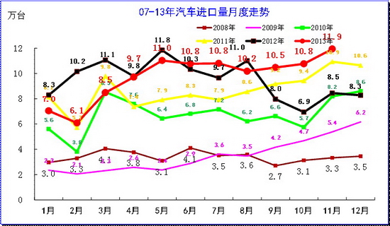 根据全国海关统计,2012年中国汽车整车进口113万台,增速9%,增长动力减弱。13年1-11月整车的进口107万台同比增速2%,进口在连续7个月暴跌后6月开始逐步回暖,7-10月基本保持稳定,11月大幅回暖。相对前几个月减库存状态,11月的11.9万台的进口车持续说明需求相对恢复,零售目前也在10万台左右。