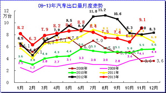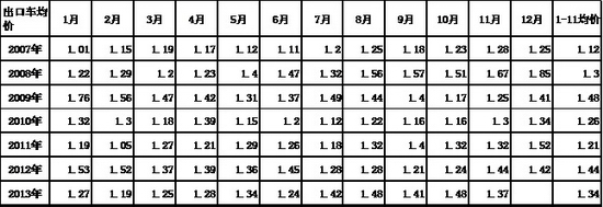 12年1-12月全国海关出口101.6万台,增速20%,13年1-11月的出口增速回落到-6%的较低水平。总体看今年的进出口走势逐步弱化,出口趋弱而进口回暖,尤其是随着人民币升值突破6.1 和日元贬值,今年的出口高增长难度大,日系进口车回升的可能性大。