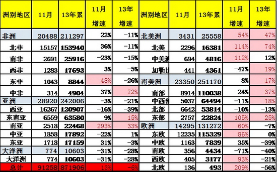 13年11月的汽车出口增长13%,其中欧洲和北美的出口出现高增长,而非洲也有恢复性增长,从区域看东非、南亚、东欧、北美、南美东部等出现较好的增长局面。