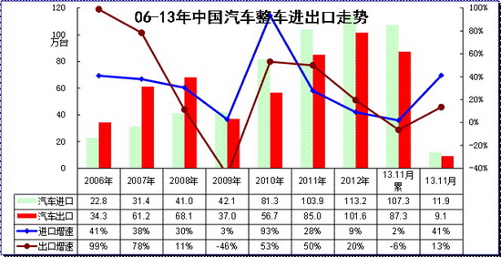 12年汽车行业的增长面临双向压力,主要是进口的大幅减速和出口的低增长,这样使国内需求的低迷仍未有效改善。13年的出口均低迷,国产厂家国内增长20%,而11月进口厂家销量增长42%,出口增长5%,进出口不旺的局面迫切需要国内车市的本土化增长。