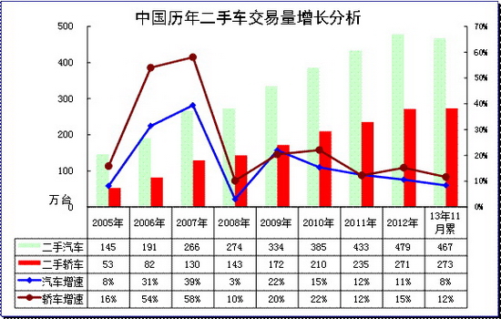 根据中国汽车流通协会数据,2013年1-11月交易量交易量 466.96万辆,相比去年同期增长 8.39% .交易额 2592.61亿元,相比去年同期增长 9.30%。其中基本型乘用车 272.84万辆,同比增长 11.61%,交易额 1549.40亿元。客车 69.20万辆,同比降低 2.05%,交易额 287.78亿元。载货车 60.59万辆,同比增长 1.14%,交易额 249.39亿元。越野车 14.91万辆,同比增长 52.48% ,交易额 240.40亿元。。