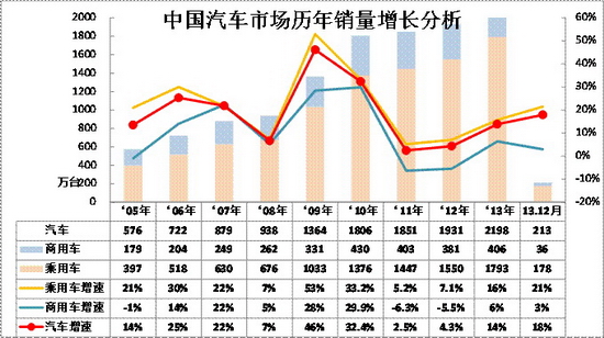 根据中国汽车工业协会数据,2013年1-12月的中国汽车累计批发量2198万台,增速为14%,较12 年累计增速增加10个百分点,这主要是12年日系低迷因素的基数偏低。