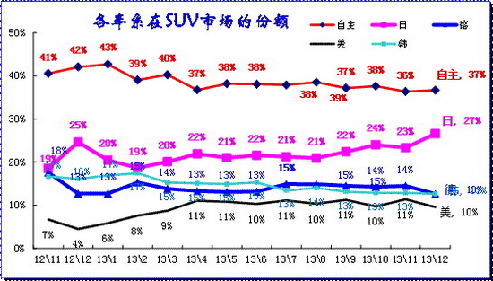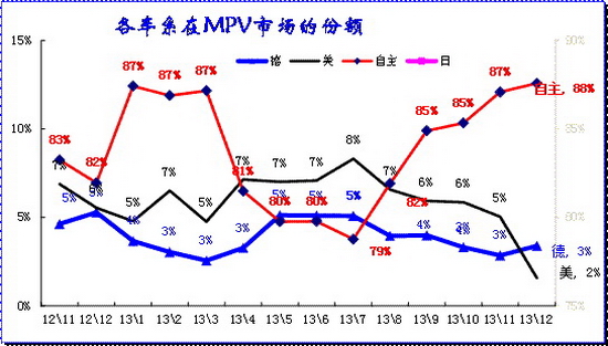 SUV市场从日系主导的市场转为近期的自主为主导的市场,近两年日系在SUV份额严重下滑,德系也因缺乏新品而表现偏弱。市场格局重新调整。相对12年同期,13年12月的日系已经开始恢复,德系下滑4%,韩系下滑6%。