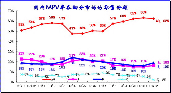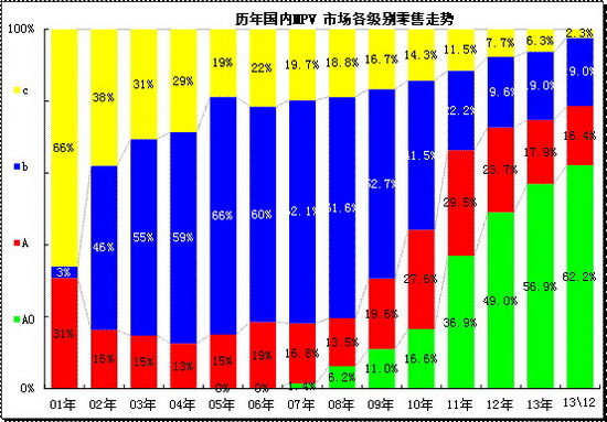 MPV 市场的起步时产品较少,GL8和普利马形成MPV 的绝对主力。随着02年奥德赛、瑞风等的进入,MPV 市场进入以B级和C 级为主的时代。08年开始的A0级MPV 逐步进入,而且在10年取得17%的较好业绩。随着五菱宏光和长安欧诺进入,11年- 13年a0级MPV份额持续增长,13年到57%的高位,12月跃升到62%左右。