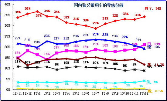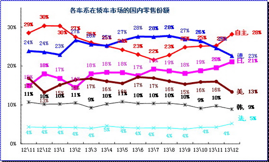 轿车市场的日系复苏,其他合资品牌调整是目前的状态趋势。自主品牌销量波动剧烈,12年12月达到30%的近期高点,随后大幅回落到13年7月22%,12月回升到28%。