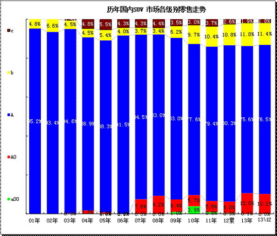 由于零售数据能更好的体现真实的市场状态,尤其是年末的厂家销量转移带来的结构性丢量容易误导市场结构,因此年初的零售分析更有价值。中国车市主要的趋势还是中大型化,这样的趋势在05年后尤为明显。尤其是A级车的走势持续增强,近期的小型车又快速跟进,加之SUV等车型的崛起,形成13年车市的A级走强、B级企稳的复杂化特征。而今年的A0级MPV扩张带来的市场增长推动结构性低端化,这也是额外的增量。