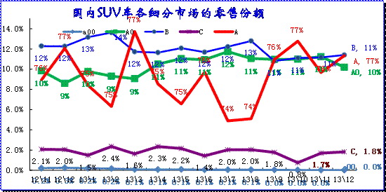 SUV市场的热点发散后集中,现在又面临热点扩大的趋势。SUV 市场多年来依旧维持A级超强的走势,这其中的A 级包含所有的传统皮卡型SUV的产品,这样不影响总体分析效果。前几年A级SUV份额出现持续的下降,这是市场发散的结果。而11年-12年的A级SUV份额增长,13年12月的份额回落到77%,这主要是小型SUV新品的促进。13年的A0及份额增长到10.6%,12月达到10.2%,这也是SUV市场发散化的趋势。