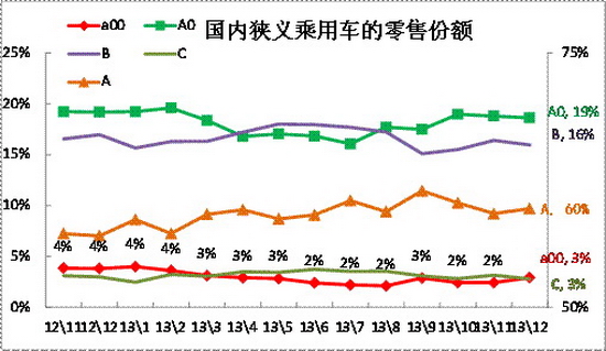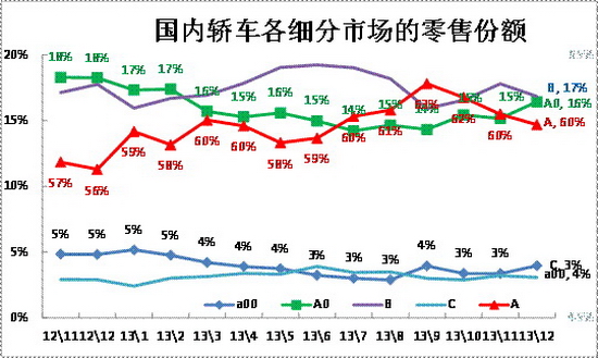 同样的A0级车和B级车的份额也是在17%左右徘徊的,12年11月至13年3月的B级车份额受日系销量下滑而回落,4月的B级车超越AO级而恢复地位,8月的A0级车已经反超B级车,9-12月的A0级车因微客类MPV而份额偏高。而A级车作为车市的核心支柱,其份额近期在59%左右缓步上升,13年12月达到60%,形成稳定的主力市场。