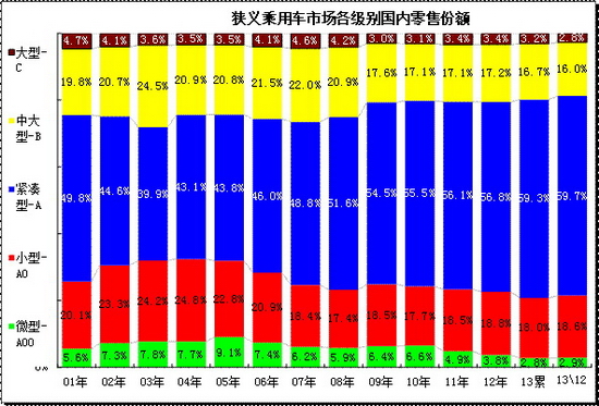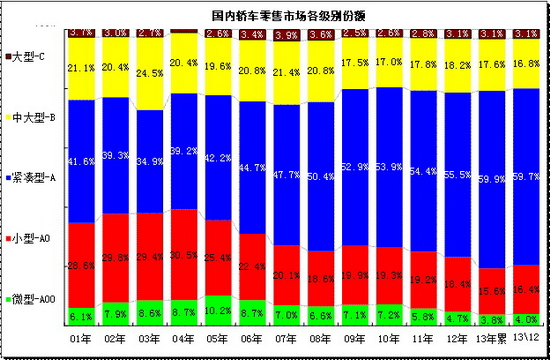 此图应分两部分看,01-08年的走势和09-12年的变化两部分。从01年到08年的总体走势是高级别下压,A级车型表现较强,09-12年是重演05-08年的趋势。但13年的经济型车低迷急速严峻。