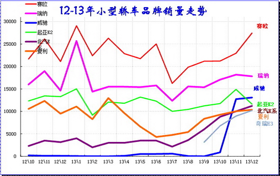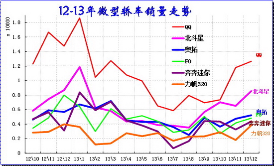 由于大城市限购,小城镇喜欢大空间的,年轻人喜欢时尚品牌的,今年的微轿极其艰难,尤其是年末的微轿市场的反差巨大。13年底的微轿车型基本都比1月销量高,而12年的很多车型12月销量比11月低,这说明今年微轿车型没有藏量的资源,也是市场较弱的表现。11-12月的QQ是在努力拉升销量,而奔奔迷你也是出现小幅回升,没有12年同期的大幅回调的现象。