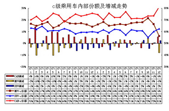 C级乘用车的内部结构变化受到进口车等影响较大,MPV\SUV的主力车型在进口车中,因此国产车中轿车市场的主导地位突出。 C级国产SUV是非市场主流的日系公商务和军用产品。治理公车也导致高级车市场缺乏活力。