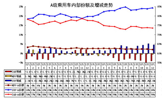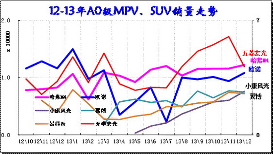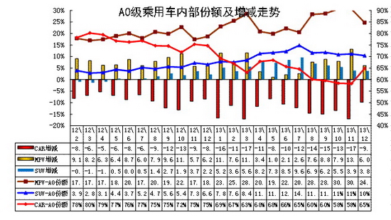 SUV的市场地位快速提升。12年的下半年开始的小型SUV异军突起,合资品牌和内资品牌均在此强力突破,小型车市场偏向SUV走强。12年12月以来的绚丽转哈佛m4带来销量提升较快, 12年底上市的昂克雷进一步把小型suv 市场做大,3月的翼博新车上市并掀起价格风潮,这对SUV市场的普及化暴增有促进。13年12月的小型SUV占比达到10%,同比增长3个百分点。新品成为推动A0级车的全面延伸的标志性车型,而价格是催化剂。