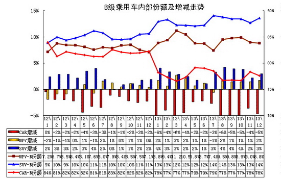 B级狭义乘用车的内部结构也是偏向SUV等多功能车型,这从12年5月开始凸显。虽然12年9-12月的日系SUV、MPV丢量推动轿车份额恢复,但轿车趋势性下降仍是不可避免。今年的韩系B级SUV也开始推出,这也大幅加剧了SUV的B级市场份额扩张。