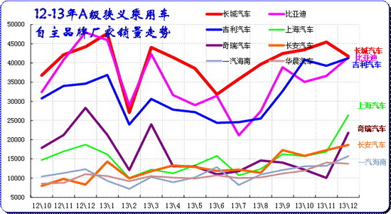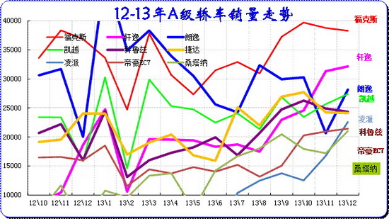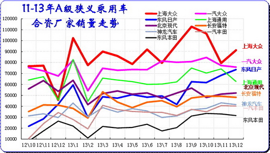 A 级车是合资企业超强的主力细分市场,主力厂家在此表现较强,尤其是9-12月的市场高潮期的A级车必然暴增,今年的合资主力企业增长相对去年稍好,去年过于保守。今年12月的主力厂家仅上海通用销量稍有下降,其他厂家基本保持11月的水平。
