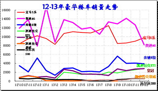 奔驰、奥迪、宝马等豪车三巨头在中国竞争激烈,豪车三强面临同样的欧洲负增长压力,中国市场的增量成为最重要的目标。由于豪车三巨头在中国的地位拼争超级激烈,奥迪与宝马的C级车竞争咬合的日益紧密,但新宝马5系导致价格回升、销量走势不强,奥迪A6价格保持很好状态,零售量也是达到超高水平,只是批发稍有收缩。