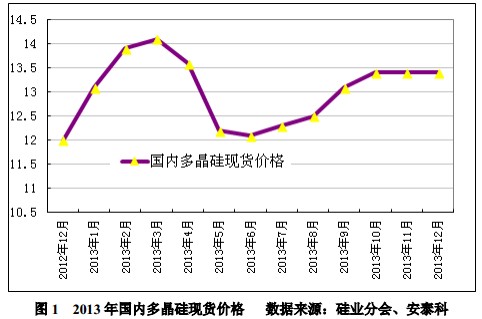 一、企业纷纷复产。受我国对美韩“双反”初裁利好,到2013年底,国内大约有13家多晶硅企业恢复生产,国内开工率达 30%以上。二、国外倾销依旧。2013年1-11 月我国进口多晶硅量累计达7.2 万吨,预计全年进口量达7.9 万吨。进口均价方面,2013年1-11 月我国多晶硅进口均价为18.71 美元/千克,同比下滑 27.4%。可见国外倾销依旧持续。三、价格低位徘徊。受国外倾销影响,全国内多晶硅现货交易均价降至13 万元/吨,同比下滑 16.7%。四、下游需求向好。国内光伏配套政策陆续出台,国内光伏市场规模逐步启动,预计全年光伏安装量在9GW 左右。
