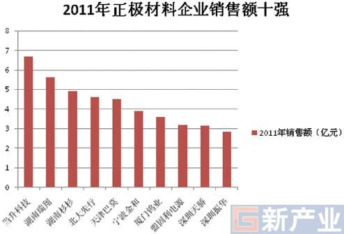 2011年,尽管大陆正极材料企业整体产量增长超过25%,但由于价格下跌,市场规模却萎缩近2%。(图3:2011年销售额前十大正极材料企业)天津巴莫强势崛起2012年,主要受智能手机、平板电脑、电动自行车等应用市场需求增长带动,锂电池产量快速增长,相应地带动正极材料产量的增长,但正极材料价格却延续了2011年的下跌走势,最终结果是正极材料市场规模仅有小幅增长。