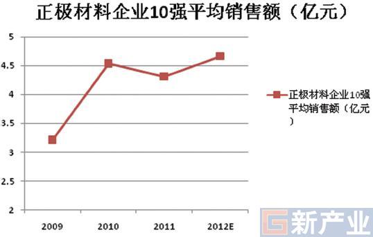 2009-2012锂电正极材料企业销售额前10强的榜单显示出很强的稳定性,尽管排名有所不同,但是有9家企业同时登上2012与2009榜单。同时,前10强的销售总额占我国正极材料市场规模的比重也维持在83%左右。这都显示出最近几年内我国正极材料的竞争格局并未发生根本性的变化,而中小企业要想跻身10强困难重重。(图5:2009-2012正极材料企业10强平均销售额及预期)