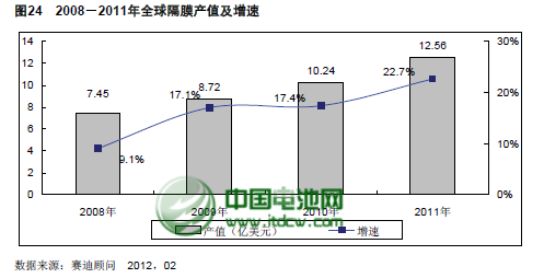 从产值来看,2011年全球锂离子电池的产值达到12.56亿元,同比增幅为22.7%,保持了较快的增长速度。产值增幅低于产量增幅的主要原因是随着锂离子电池隔膜的逐步产业化和产量的逐步增加,其单价保持着逐步下降的趋势,从而导致整个隔膜的市场规模增幅出现一定程度的下降。预计未来整个隔膜的平均单价将继续保持3-5%的递减趋势,但是产量的快速增长仍将带动全球隔膜的市场规模保持较快的增长趋势。