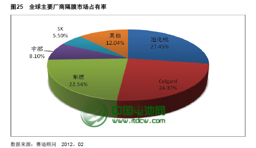 从竞争格局来看,目前世界上只有日本、美国等少数几个国家拥有锂离子电池隔膜的生产技术和相应的规模化产业。供货商以日本旭化成(AsahiKasei)、美国Celgard及已并入Exxon集团的东燃(Exxon-Tonen)三者为主要厂商,再加上日本宇部兴产(Ube Industries),前四大厂商总市占率已达82.46%,主要面向三洋、索尼、松下、三星SDI、BYD等大型电池厂商。