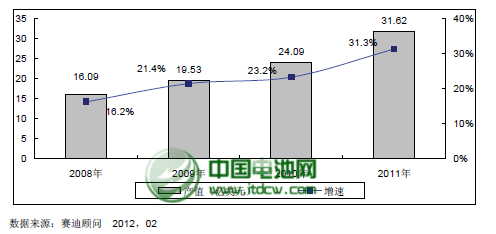 中国范围来看,作为世界上最大的锂电池生产制造基地和第二大锂离子电池生产国和出口国,中国对隔膜的需求日益增加。2007年,中国隔膜的市场规模仅为13.85亿元,在中国优良的投资环境和相对低廉的人工成本的作用下,未来几年锂离子电池产业在全球范围内向我国转移的趋势将越来越明显,从而带动整个隔膜的市场规模快速增长,2011年中国隔膜产业的市场规模达到31.62亿元,同比增长31.62%。