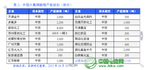 在核心原材料六氟磷酸锂方面,2011年之前,只有天津金牛能够生产出六氟磷酸锂产品,但也主要是自用。到了2011年,以天津金牛、多氟多、广州天赐、江苏九九久等为代表的中国企业共产销六氟磷酸锂超过610吨,占当年全球六氟磷酸锂产销量的14.35%。2012年,这4家企业的六氟磷酸锂产量之和超过了1,400吨,较上年度翻了一番有余。同样,中国六氟磷酸锂的产能规划也非常惊人,见表2【详情请见2013年04月的《锂电信息动态与分析》】。