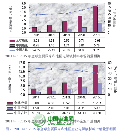 虽然从绝对量上看会表现不错,但现在中国电池网-中国电池杂志战略合作机构——真锂研究依然认为,中国企业电解液产销量的全球占比,将从2011 年的48.70%下降到2015 年的40.30%。真锂研究的主要考虑因素是:动力锂离子电池市场份额的快速增长以及人们对电动汽车安全因素的更加重视,技术水平普遍不高的中国电解液企业在这个市场要取得好成绩会很困难。尽管如此,到2015 年,中国电解液材料企业的产量总体上还是能够满足中国锂离子电池企业的需求。