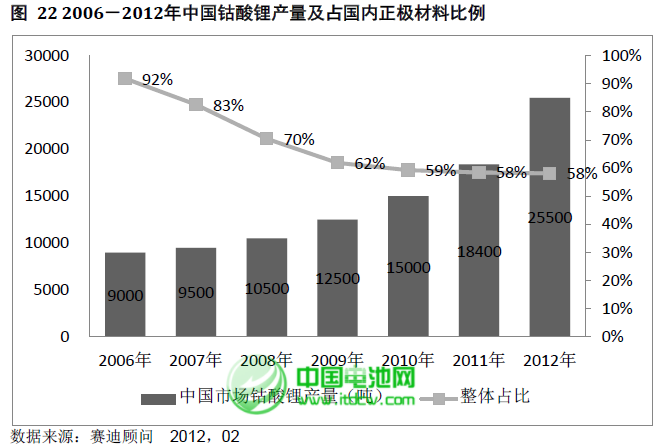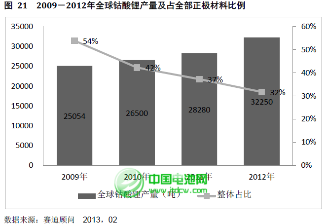 2012年全球钴酸锂销量为31200吨,占全部正极材料的52.5%,在整个正极材料市场中占据了绝对重要的地位。随着正极材料技术的不断成熟,三元材料和磷酸铁锂等正极材料对钴酸锂的替代逐步加快,赛迪顾问认为钴酸锂在锂离子电池正极材料中的地位将逐步降低,但受益于新能源汽车对动力电池需求的加剧,钴酸锂正极材料的绝对数额在未来两年内还是会保持一定程度的上升,且其在正极材料中仍处于主导地位。