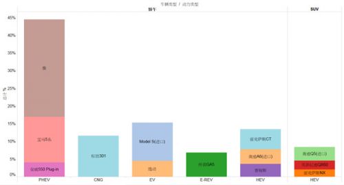从动力类型来看,SUV车型目前主要集中在传统混合动力(HEV)类型中,PHEV类型中并未出现SUV,纯电动车中,除品牌知名度最高的特斯拉外,用户对产品的关注还是主要集中在了长安逸动EV这款车型上,表现出逸动EV在该细分市场具有一定的竞争力,而HEV车型中排名前三的均以进口合资车型为主。
