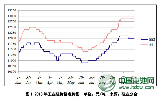 本月工业硅价格持稳,成交平平。10 月各品牌价格以每周 100-150 元/吨的速度一路上扬,超过下游采购商心理价位,买卖双方对后市多持观望态度,导致11 月成交量出现下滑。有云南厂商表示今年枯水期电价已基本敲定,云南地区枯水期电价在 0.35-0.45 元/度;四川地区枯水期电价上调至 0.33-0.43 元/度,与丰水期相比上涨近 0.1 元。随着电价上涨,部分企业已经停炉,另外由于云南加大环保力度,取消 2014 年砍树指标,对一部分些依赖木炭作为还原剂的企业也造成不小影响。
