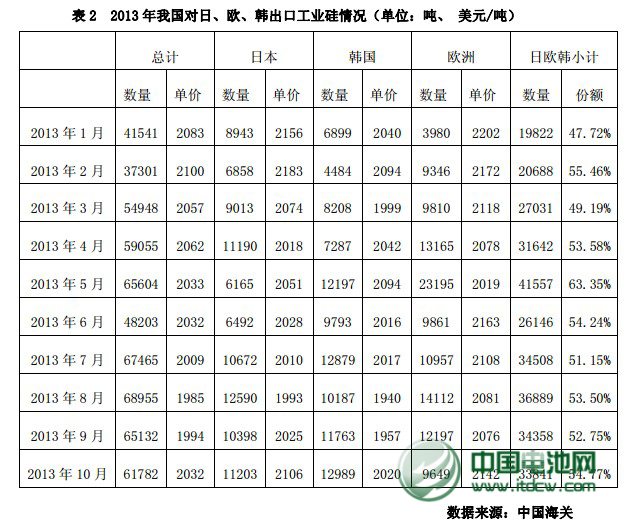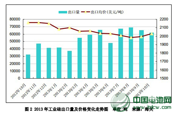 海关统计数据显示,2013 年 10 月份我国工业硅出口量为 6.2 万吨,环比下降 5.1%,同比上升 75.0%。10 月份出口均价为 2032 美元/千克,环比微幅上升。