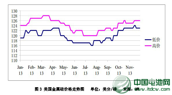 本月美国工业硅价格基本持稳。美国工业硅巨头环球冶金公布了 2014 财年第一季度财务报表。报表显示,2014 财年一季度环球冶金实现净销售收入 1.73亿美元,销售硅系合金及工业硅 6.2 万吨,较 2013 财年四季度环比降 4%。息税折旧摊销前利润为 2140 万美元,较上一季度减少 240 万美元。环球冶金销售量下降的主要原因是由于 Becancour 厂工人自 2013 年 5 月开始的持续罢工及国外