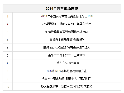 中国汽车市场经过这么多年的高速发展,最近几年发展速度已经逐渐放缓,对于一些不利于市场发展的政策消化能力也在逐渐加强,曾经的各种补贴退出市场后,相关车型销量并未受到太多的影响。而上述的一些关于市场的预测是否准确,到2014年底请网友们再来证明我们的预测。