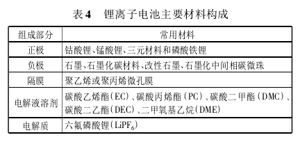 锂离子动力电池主要由正极材料、负极材料、电解液和电池隔膜4部分组成(见表4)。