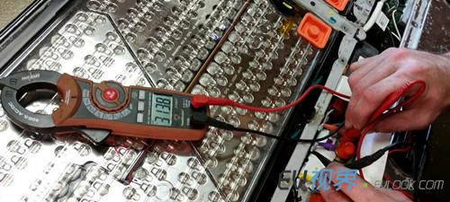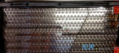 5.单个电池模块俯瞰图 6.将电压表接上主触点的hot side部分,即可读取整个电池组的电压——313.8V。 7. 单个电池模块电压196.3V 8. 近距离观察电池组的主保险