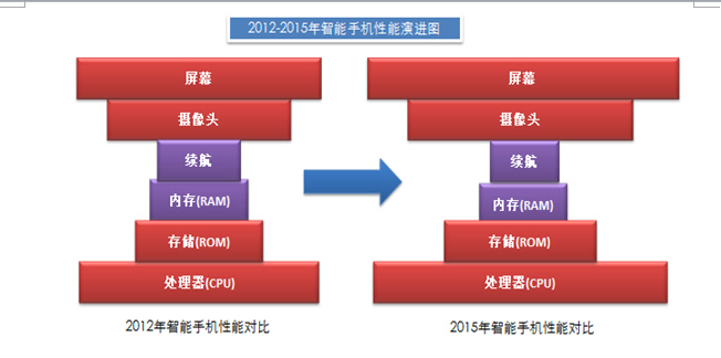 手机已经从通信终端演变成为移动互联网终端,用户对手机的功能的需求、对手机体验的需求也在不断变化。手机从以打电话、发短信、看内容为主,演变成为交互应用为主;用户对手机体验的需求,从信号好、待机长,演变成为网速快、运行快、拍照好等。但遗憾的是,手机技术的发展却很不均衡,有的发展太超前,有的却一直拖后腿,使得手机产品一直存在明显的体验瓶颈,一些瓶颈甚至快成为压垮手机行业乃至移动互联网行业发展的致命因素了。下图是我制作的近三年(2012-2015)手机主要配置和性能演进图: