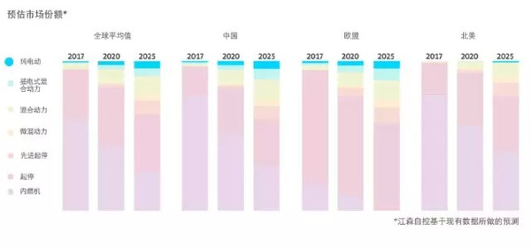 根据江森自控基于车企产能的预测,无论是中国、北美还是欧盟,到2020年,甚至2025年,纯电动以及插电式混合动力汽车的份额都十分有限。