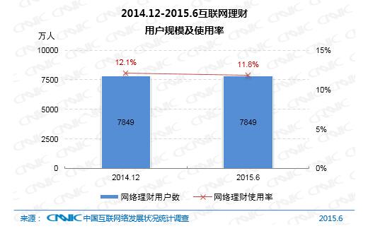 历经高速增长期后,2015年上半年互联网理财使用率进入平台期。截至2015年6月,购买过互联网理财产品的网民规模为7849万,与2014年底持平,网民使用率为11.8%,较2014年底下降了0.3个百分点。