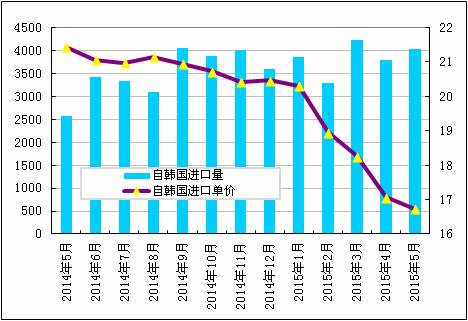 2015年5月份从韩国进口多晶硅量增加至4027吨,环比增幅为6.1%;5月份进口单价小幅下滑至16.74美元/千克,环比降幅为1.9%。