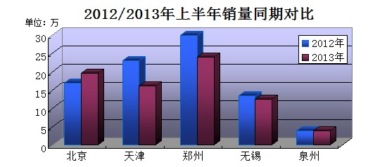 记者对北京、天津、郑州、无锡、泉州五个城市经销商进行了抽样调查,数据显示,与2012年上半年销量对比,除北京市场增长15%外,天津、郑州、无锡、泉州四城市销量均呈现不同程度的下降,其中天津下降幅度最大达30%,郑州下降20%、无锡下降7%,泉州基本持平。