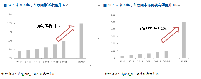 渗透率快速提升,市场规模爆发。车联网有望迎来五年十倍的高景气周期,国内车联网的渗透率从不到5%,提升至20%以上(易观国际在汽车行业的业内人士预测2015年我国车联网用户有望突破10%的临界值)。以1亿民用汽车保有量计算,用户数有望从目前不到500万上升到2,000万以上。目前车联网设备功能较为简单,单价在1,000元左右,而随着触控、语音等移动互联网技术融合到新型车联网设备,单价有望从1,000元上升至2,000至5,000元(类似于从功能手机到智能手机的市场扩张过程)。仅车联网硬件的市场空间有望从50亿,跨越到500亿-1,000亿。此外车联网服务的ARPU值有望达到1,000元/年,车联网服务的年市场空间为200亿以上。因此,总计市场空间至少在500亿每年,是目前市场空间的十倍。