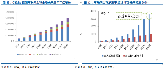 车联网硬件价格下降,从高端车系向大众车系普及。随着移动互联网设备的成熟和发展,车联网硬件从过去1,000美元以上已经降到500美元。在互联网厂商介入后,相关设备的价格将继续快速下降。此外,根据产业链调研,大多数国际整车厂已经开始将车联网预装在大众车系上,包括荣威、吉利等本土汽车品牌也已经逐渐在部分车型上预装车联网系统。