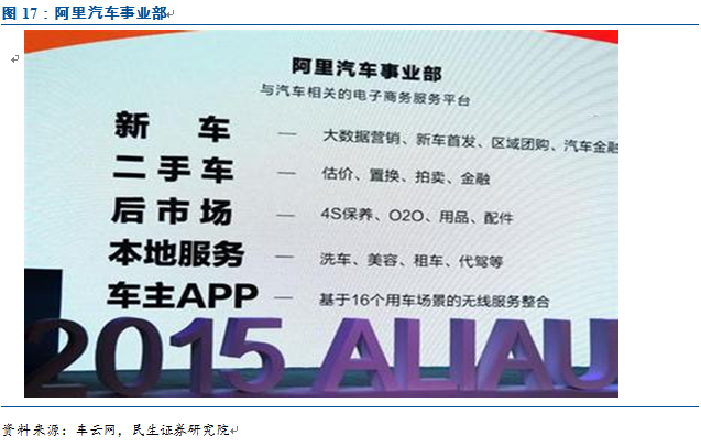 阿里成立汽车事业部,搭建全新平台,力图向车主提供看车、选车、买车、用车、卖车全链路的汽车电商服务。2015年4月,阿里宣布成立汽车事业部,由原天猫汽车、淘宝汽车、汽车O2O三个团队合并而成,未来将以“车主+”战略为中心建立一个新的平台,并与负责大数据营销的阿里妈妈、汽车金融的蚂蚁金服以及汽车生态产业链各方协同合作,力图向车主提供看车、选车、买车、用车、卖车全链路的汽车电商服务。
