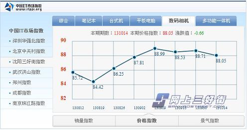 与销量指数的持续走低到平稳完全相反,价格指数持续走高到最终平稳。期初130819期为最低点84.42,这个时候相机厂商都在蓄力发布新品,各大商家 都纷纷开始清理库存,对库存商品进行低价促销的处理。自130819期往后,新品逐渐发布,价格趋势持续上涨从84.42点到86.25点到87.81点 到最高130909期的88.99点,这个区间正好处于相机产品新旧交替,清理的旧货逐渐被新货所取代,价格也就自然高涨。从130909期开始到目前的 131014期相机产品的新旧交替逐渐结束,新品占据主流,价格指数自此趋于稳定。