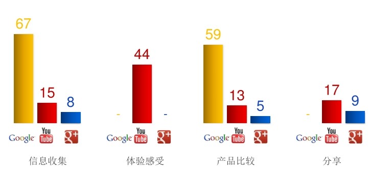 以谷歌的产品为例,谷歌搜索在信息收集和产品比较阶段的影响非常明显,六成消费者曾使用过谷歌搜索收集信息和产品比较;YouTube主要体现在体验感受阶段,超过四成体验者会通过YouTube进一步理解产品,17%会通过YouTube进行分享;Google+社交网络更多体现在信息收集和分享阶段。