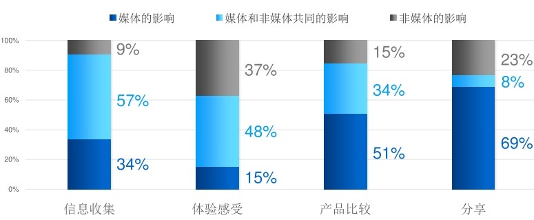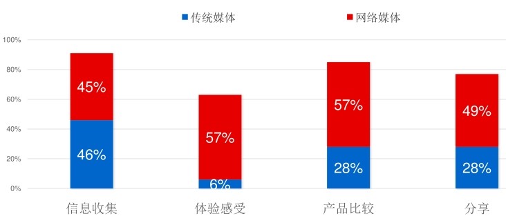 1.在传统媒体的基础上,网络媒体将媒体的影响提升了一倍乃至九倍,尤其在体验感受阶段,线上媒体提升超过了九倍。