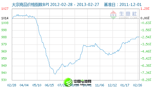 2月26日大宗商品价格指数BPI为989点,与昨日持平,较周期内最高点1019点(2012-04-10)下降了2.94%,较2012年07月02日最低点938点上涨了5.44%。(注:周期指2011-12-01至今)